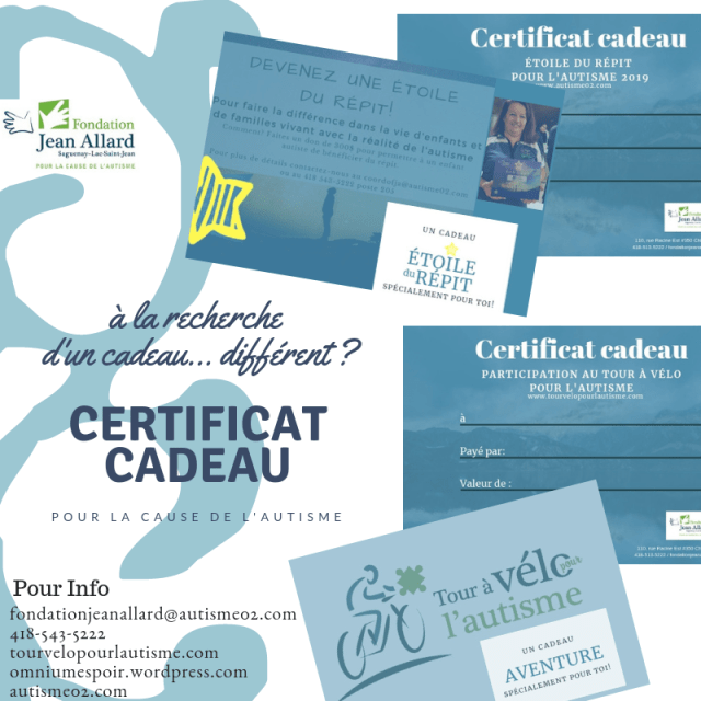 Pour Étoile du répit : la personne qui achète le certificat cadeau à droit à un reçu d’impôt . La personne qui reçoit le certificat se verra offrir une plaque Étoile du répit à son nom. Son nom apparaîtra également sur la plaque de reconnaissance des Étoiles du répit à la Fondation Jean Allard.